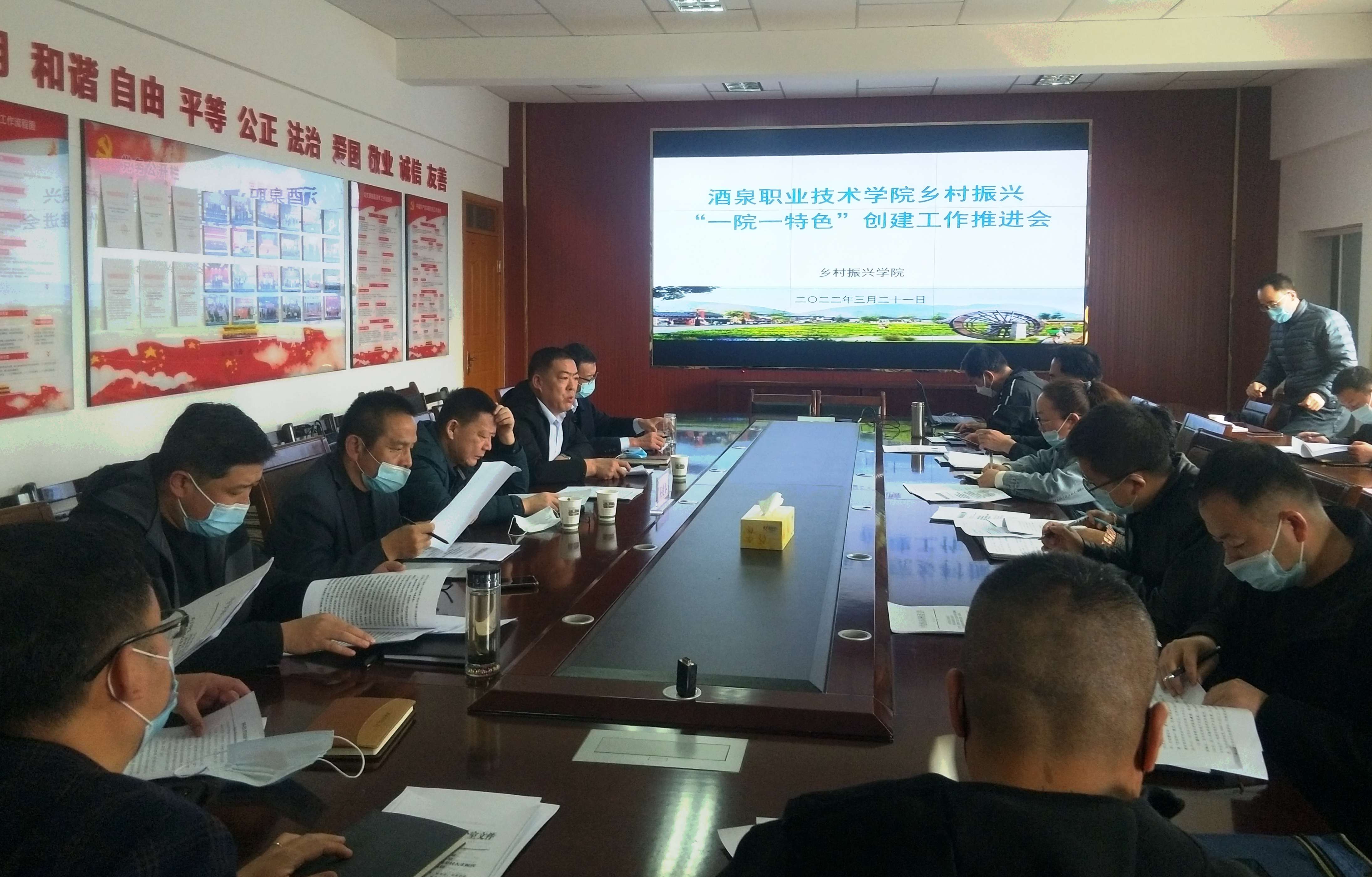 会上,党委委员、副校长吴建春宣读了《酒泉职业技术学院关于设立乡村振兴学院的通知》;乡村振兴学院院长张祥做了乡村振兴学院2022年工作部署与“一院一特色”创建活动要求;乡村振兴学院教师马清国领学了《酒泉市关于加快推进乡村人才振兴的实施方案》;各二级学院副院长对所属学院乡村振兴工作思路及“一院一特色”创建活动进行了热烈讨论和交流。
