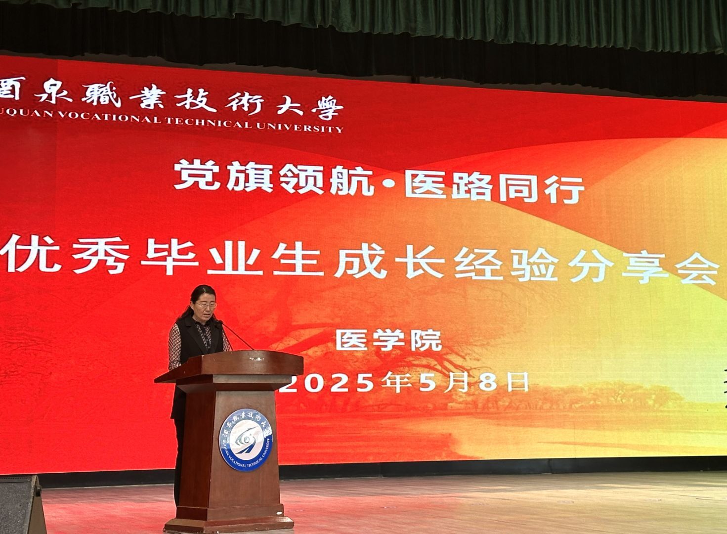 5月8日,医学院党支部在胡杨活动中心成功举办"党旗领航·医路同行"优秀毕业生成长经验分享会。会议由医学院党支部副书记段国萍主持,6位来自医疗一线的优秀毕业生重返母校,与500余名师生分享了他们在党建引领下的职业成长故事,展现了新时代职教学子的风采。