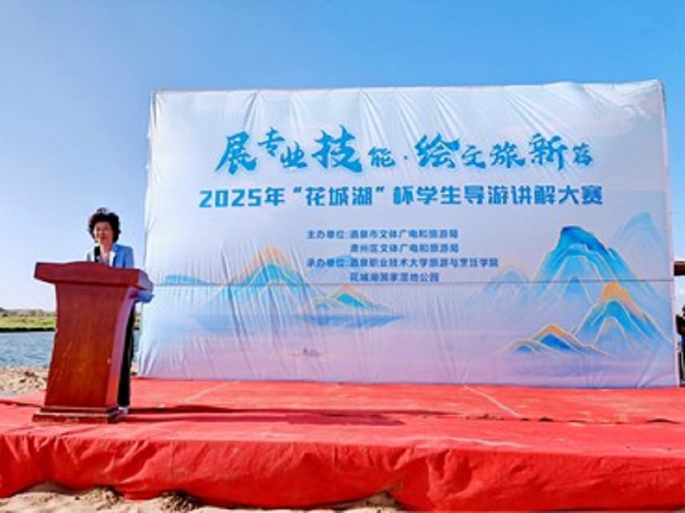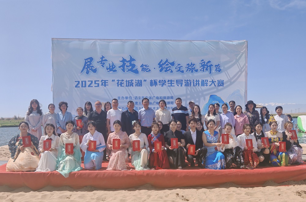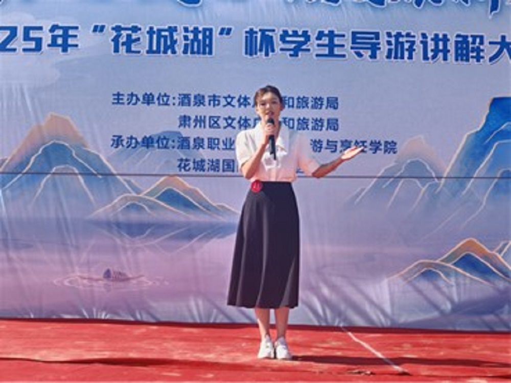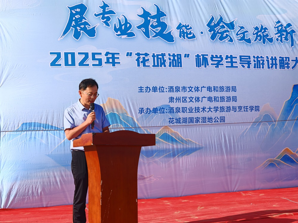 为深化教学成果,提升学生实践技能,2025年6月15日,由酒泉市文体广电和旅游局、肃州区文体广电和旅游局指导,酒泉职业技术大学旅游与烹饪学院联合花城湖景区承办的 “展专业技能·绘文旅新篇”2025年“花城湖”杯学生导游讲解技能大赛,在花城湖风景区成功举办。来自旅游与烹饪学院的选手同台竞技,以专业风采诠释丝路文旅魅力。
