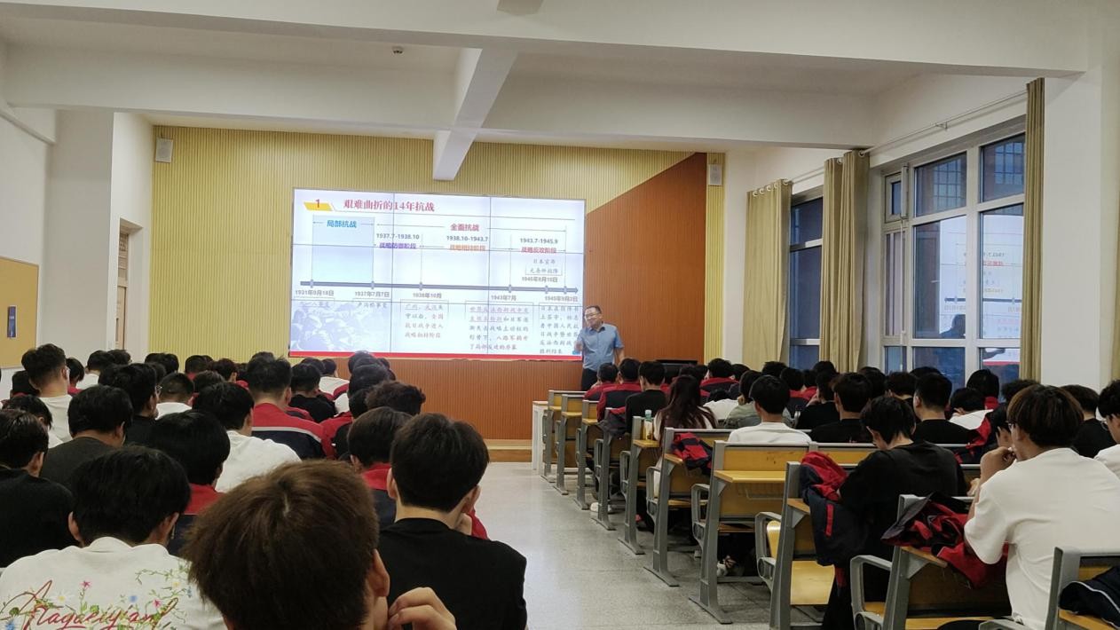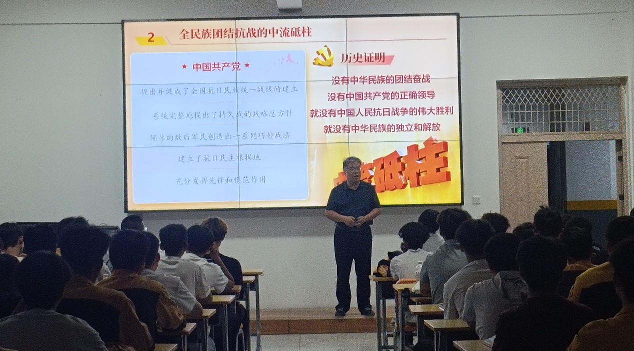 在中国人民抗日战争暨世界反法西斯战争胜利80周年之际,为引导广大青年学生深刻铭记抗战历史,汲取奋进力量,坚定理想信念。9月4日晚,学校党委委员、组织部部长茹立军,机电工程学院领导班子成员、团委书记郭安邦老师、辅导员李娟老师共同为学院全体在校生讲授“形势与政策”第一课,本次课程以“纪念抗战胜利,坚定民族信念”为主题,主要围绕“铭记历史,正义必胜”、“民族壮举,浓墨重彩”、“精神丰碑,永不磨灭”、“珍爱和平,开创未来”四个篇章展开。