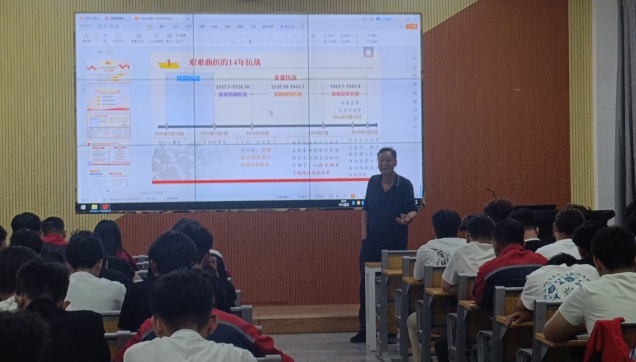 在这节思政课堂上,主讲老师带领同学们回顾了中国人民抗日战争从局部抗战到全民族抗战的艰苦卓绝的历程,深刻阐释了中国人民以巨大民族牺牲支撑起世界反法西斯东方主战场的历史贡献,讲述了全体中华儿女在国家危亡之际,共赴国难、浴血奋战的英雄史诗,深入解读了抗战精神的丰富内涵——天下兴亡、匹夫有责的爱国情怀,视死如归、宁死不屈的民族气节,不畏强暴、血战到底的英雄气概,百折不挠、坚忍不拔的必胜信念。鼓励青年学子要立足新时代,将对抗战历史的深刻认识和对伟大抗战精神的传承,转化为刻苦学习、矢志报国的实际行动,坚定“四个自信”,为实现中华民族的伟大复兴贡献青春力量。