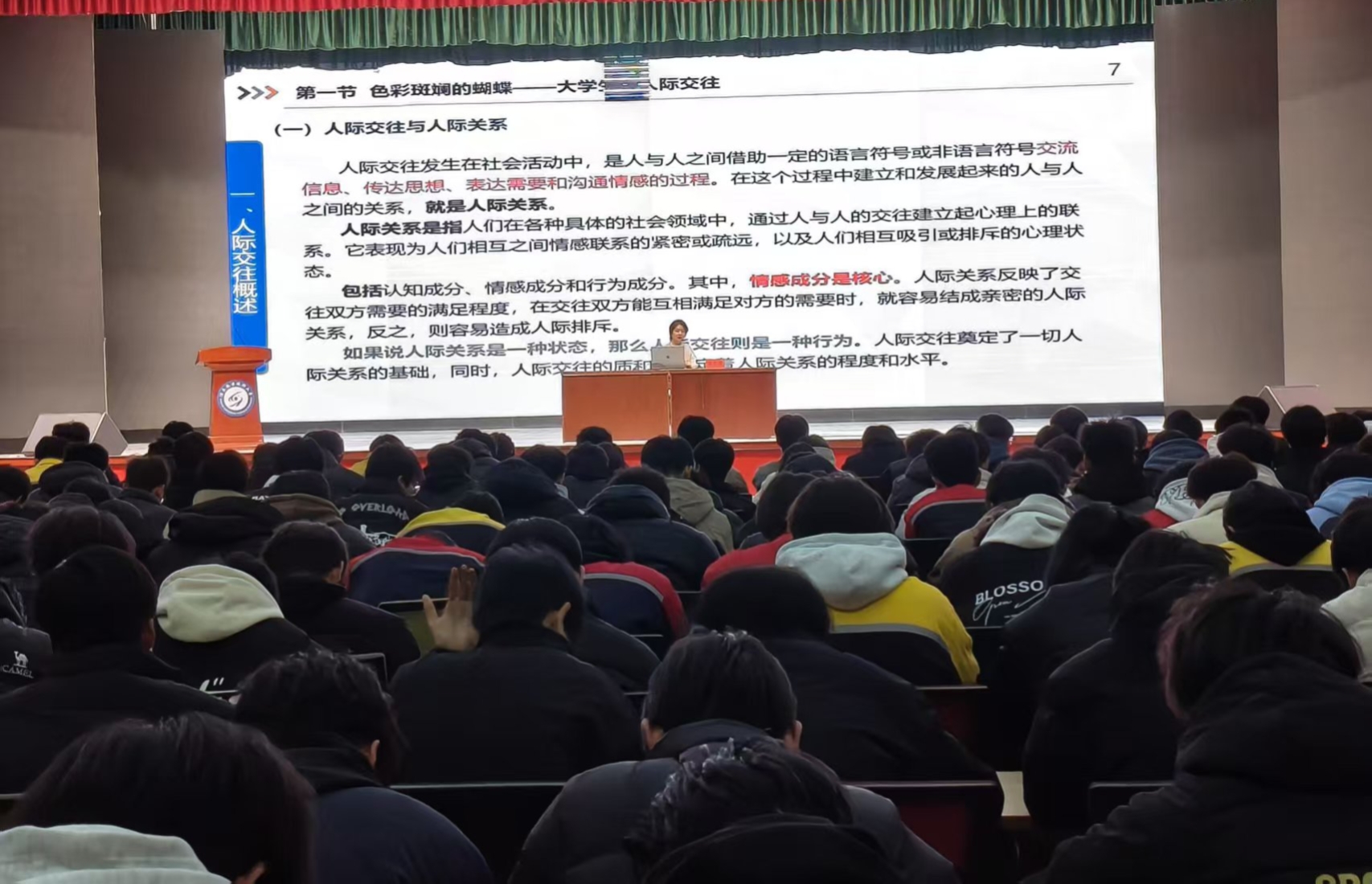 讲座中,张梦滢老师聚焦大学生现实困惑,以常见案例切入,系统阐述了大学生人际交往的心理效应、核心原则与实用技巧,并深入剖析了爱情的本质、常见心理困扰及健康恋爱观的培养。整场讲座将专业理论与丰富案例相结合,讲解深入浅出,互动氛围热烈。