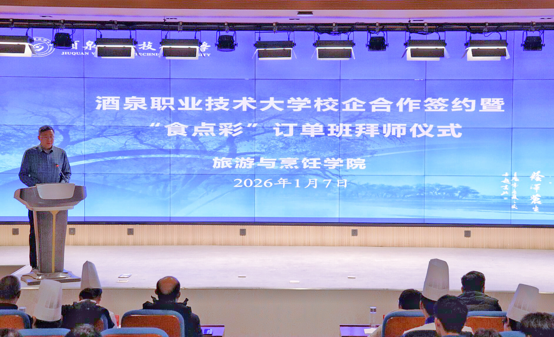要闻快递 > 正文2026年1月7日下午,酒泉职业技术大学与深圳市食点彩食品餐饮有限公司校企合作签约暨“食点彩”订单班拜师仪式举行。深圳市食点彩食品餐饮有限公司总经理孙伟民、企业导师谢海蓉,酒泉职业技术大学党委委员、副校长杨洁等出席会议。产教融合处、教务处、旅游与烹饪学院相关人员参加会议。